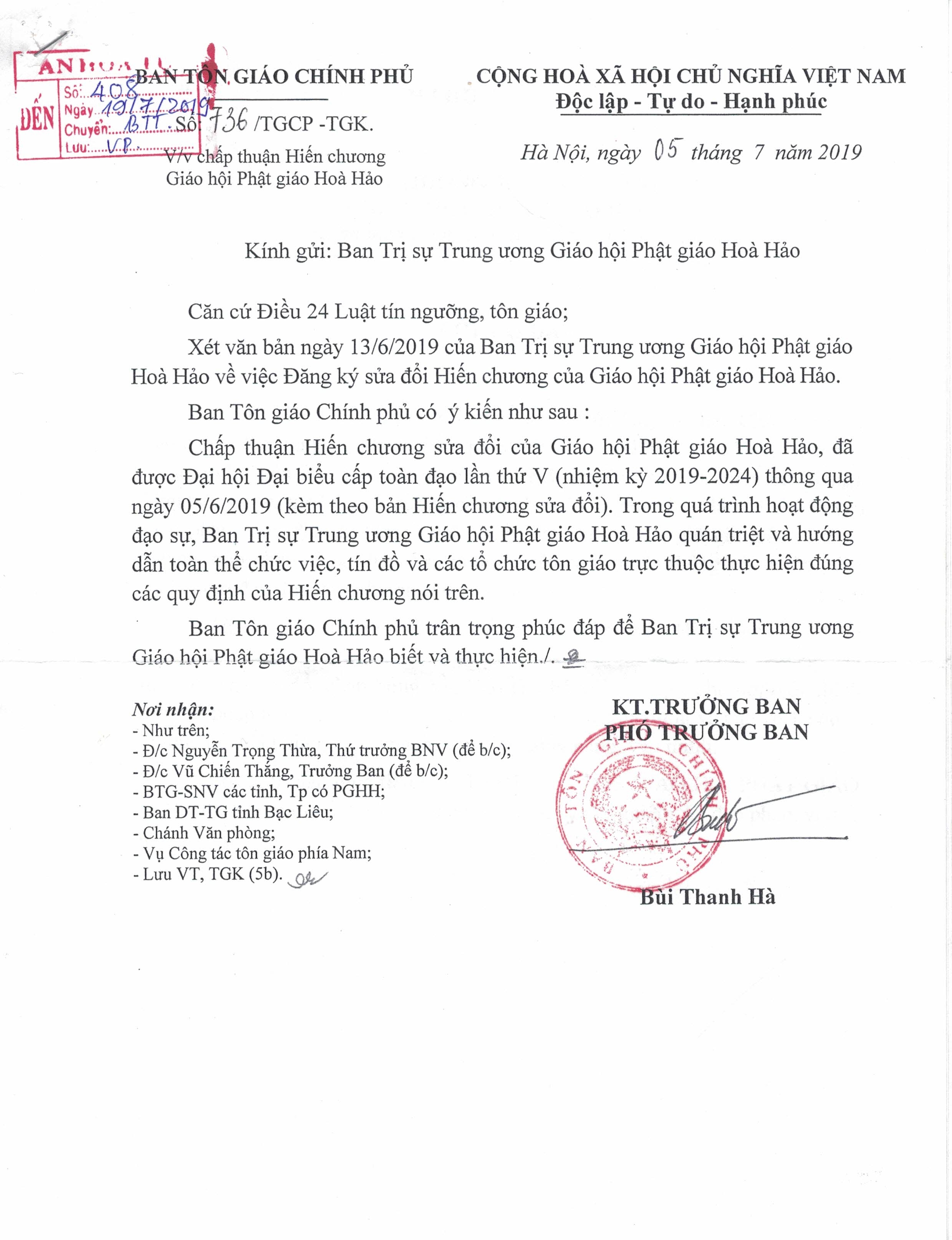 Ban Trị sự Trung ương Giáo hội Phật giáo Hòa Hảo, các Ban chuyên ngành, Ban Đại diện tỉnh, Ban Trị sự xã và toàn thể tín đồ nghiêm túc chấp hành bản Hiến chương này./.